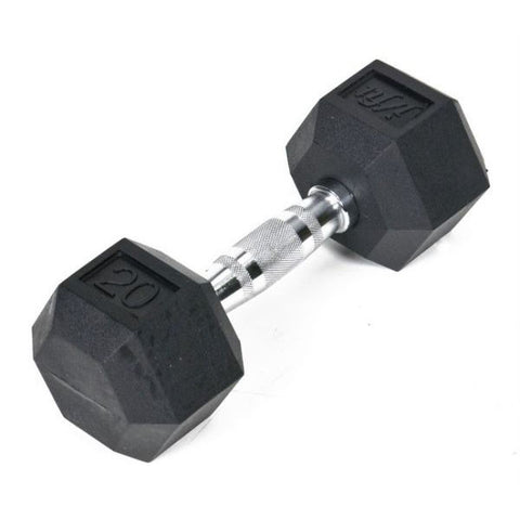 J/Fit's Rubber Coated Hex Dumbbells are the perfect solution for sculpting a firm and shapely upper body. Constructed from solid cast iron, these weights are encased in an elastic rubber to protect the dumbbell and workout surface. Hexagonal, 6-sided design prevents the dumbbell from rolling, and a chrome finished ergonomic handle reduces fatigue and improves the comfort of your grip. Sold as a single.