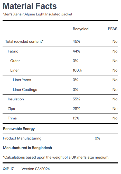 - Insulation: 60gsm PrimaLoft® Gold Active+ insulation (55% recycled content) through front, back, top of sleeves and collar